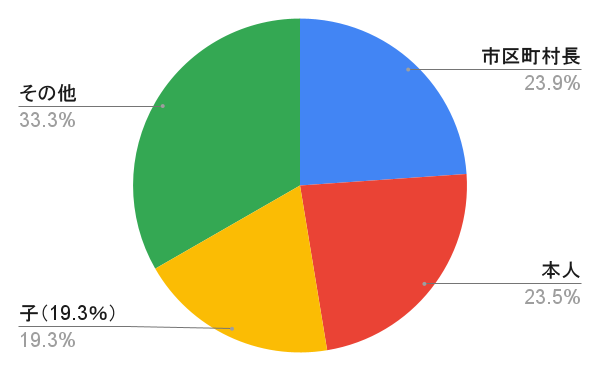 以前の参考書では「子が1位」と書いてあるものが多いですが、裁判所の最新統計(令和6年分)では、身寄りがない人の支援(市区町村長申立)が最大勢力になっています。